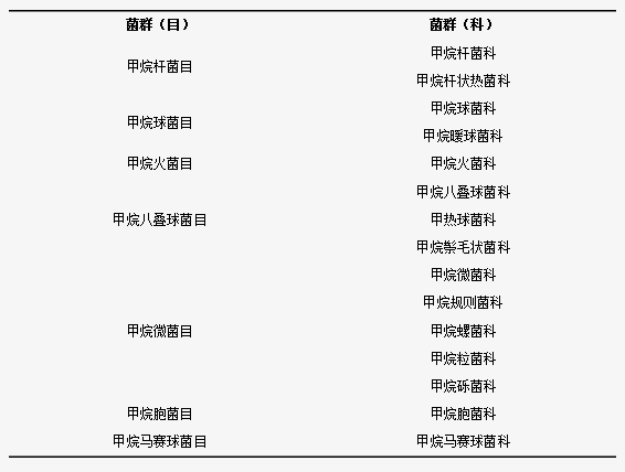 MA是專性厭氧古菌,能夠以乙酸、H2/CO2、甲基類化合物為底物合成甲烷,其代謝途徑也相應地分為乙酸途徑、CO2還原途徑和甲基裂解途徑。MA屬于廣古細菌門,現已鑒定出的菌株可分為7目、15科、35屬、150多個有效種(見表2)。