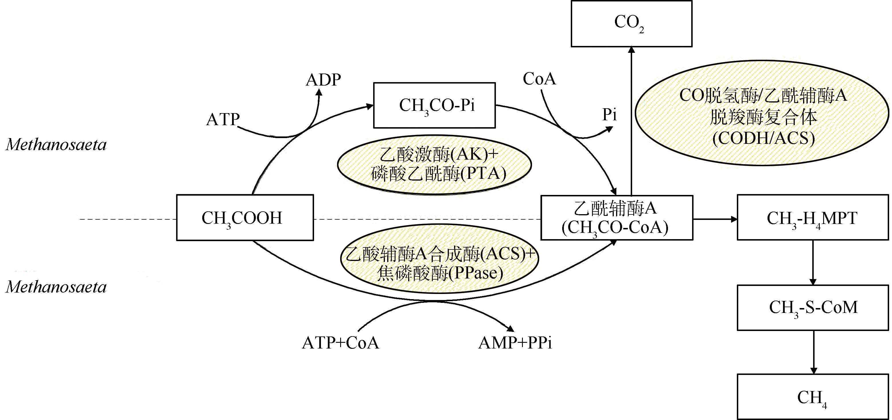 圖3 乙酸營養型MA(Methanosarcina和Methanosaeta)代謝途徑