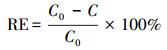 金屬離子去除率(RE)是指吸附前后目標金屬離子濃度差與初始濃度的比值, 其計算公式如下所示: