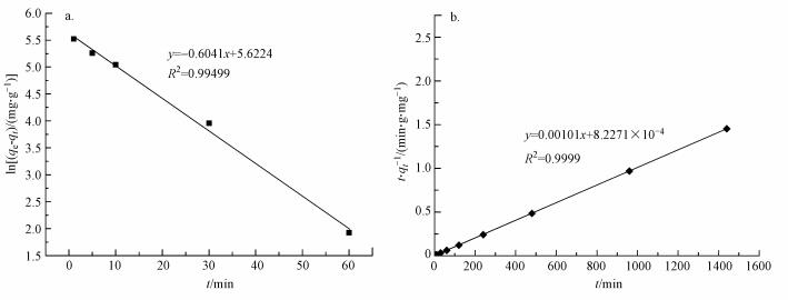 式中, C0、Ct、Ce分別為初始時刻、吸附時間為t、吸附平衡時的吸附量(mg·g-1), V為溶液體積(L), W為吸附劑的質量(g).