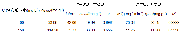 為了研究PEI-OCF對Cr(Ⅵ)的吸附動力學特性, 獲得合適的動力學模型, 分別選用準一級動力學方程(式(2))和準二級動力學方程(式(3))對試驗數據進行線性擬合, 擬合所得相關參數見表 1.