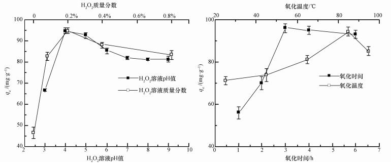 圖 1氧化階段溶液pH值、H2O2質量分數、氧化時間和溫度對PEI-OCF吸附Cr(Ⅵ)的影響