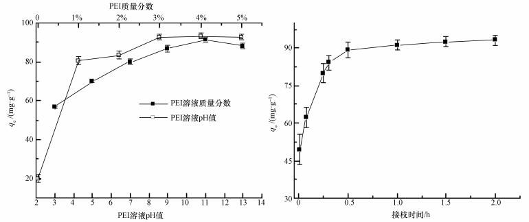 圖 2 PEI接枝階段溶液pH值、PEI濃度、氧化時間對PEI-OCF吸附Cr(Ⅵ)的影響