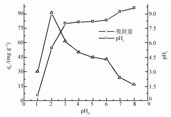 此外, 隨初始pH值從1.0增加6.0時, 溶液終了pH(pHt)值從0.6快速升高到8.0, 之后趨緩, 這主要歸因于PEI-OCF表面官能團的質子化作用.當初始pH值大于6.0后, 終了pH值又表現為逐漸升高.