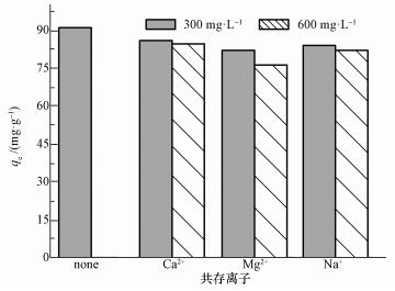 天然水體中廣泛存在著Ca2+、Mg2+和Na+等無機離子, 這些離子的存在可能干擾吸附劑對Cr(Ⅵ)的去除.因此, 本研究考察了Ca2+、Mg2+和Na+對PEI-OCF吸附Cr(Ⅵ)的影響, 結果見圖 9.從圖 9可以看到, 吸附體系中添加Ca2+、Mg2+或Na+后, PEI-OCF對Cr(Ⅵ)的吸附量均有所下降.但即使3種干擾離子的濃度增大到600 mg·L-1, PEI-OCF對Cr(Ⅵ)的吸附量仍能達到對照組的86%以上.因此, 可認為Ca2+、Mg2+和Na+對PEI-OCF吸附Cr(Ⅵ)的影響較小.