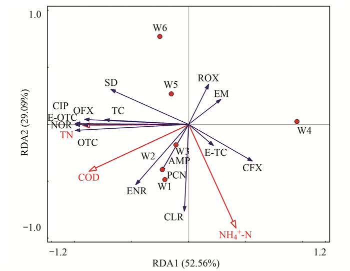 所選取的16種抗生素分別為:鹽酸四環素(tetracyclines, TC, 97%)、4-差向四環素鹽酸鹽(4-epi-tetracycline Hydrochloride, E-TC, 99%)、土霉素(oxytetracycline, OTC, 97%)、4-差向土霉素(4-epi-oxytetracycline, E-OTC, 97%)、青霉素(penicillin, PCN, 99%)、氨芐西林(ampicillin, AMP, 99%)、頭孢噻肟(cefotaxime sodium, CFX, 97%)、克拉霉素(clarithromycin, CLR, 99%)、羅紅霉素(roxithromycin, ROX, 97%)、紅霉素(erythromycin, EM, 98%)、磺胺嘧啶(sulfadiazine, SD, 97%)、磺胺甲嘧啶(sulfamerazine, SMN, 99%)、諾氟沙星(norfloxacin, NOR, 97%)、環丙沙星(ciprofloxacin, CIP, 97%)、恩諾沙星(enrofloxacin, ENR, 97%)、氧氟沙星(ofloxacin, OFX, 97%).共包含5大類抗生素四環素類(tetracyclines, TCs)、β-內酰胺類(β-lactam)、磺胺類(sulfonamides, SAs)和喹諾酮類(fluoroquinolones, FQs), 以上抗生素通過以前研究中開發的方法測定, 將200 mL水樣通過用HLB小柱進行固相萃取提取和純化, 每個樣品分別做3個平行, 并通過超高效液相色譜和串聯質譜法進行測定.