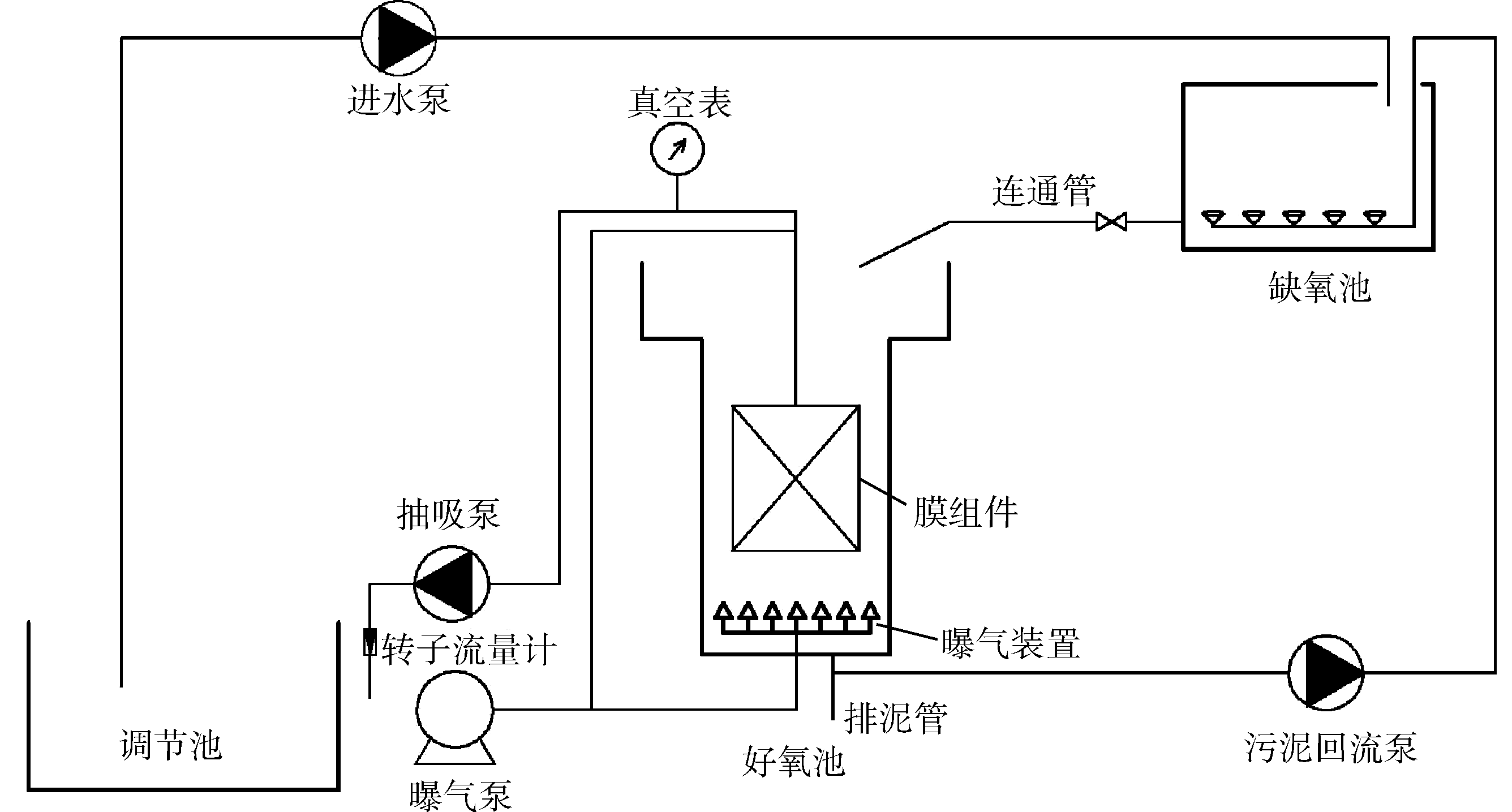 實驗裝置如圖1所示。分為好氧池(O池)和缺氧池(A池)2個部分,其中O池和A池容積分別為90 L和40 L。裝置前段設置調節池,作為實驗用水的貯水池。調節池出水經進水泵泵入A池,又經過連通管流入O池。O池中央設置膜組件,膜組件由直徑4 mm的中空玻璃纖維編織管制成,有效膜面積為1 m2,由抽吸泵抽吸出水。轉子流量計控制流量大小,真空表監測跨膜壓差(TMP)。O池底部分別設置曝氣裝置,并設置污泥回流管回流污泥液至A池,利用文丘里混流器使A池污泥保持懸浮狀態。O池、A池、調節池均由液位控制儀控制液面高度,系統由可編程控制器PLC控制運行。