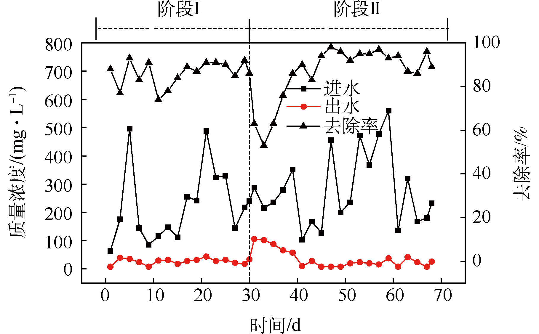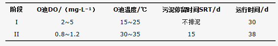 實驗分為2個階段運行。階段I為全程硝化反硝化,階段II為短程硝化反硝化。共運行68 d。運行期間膜通量始終保持約15 L·(m2·h)−1,MLSS穩定在3 500~4 500 mg·L−1,A池溫度15~25 ℃,污泥回流比為200%,抽停比為5:1,總HRT約8 h,其他運行工況如表1所示。實驗期間檢測進出水水質變化,并記錄負壓表讀數。