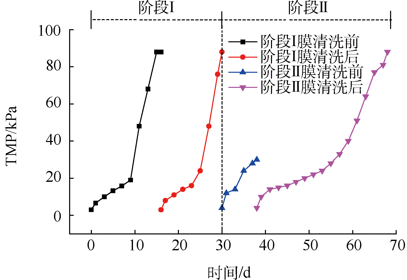 當膜組件過濾活性污泥混合液時,污染物會不斷在膜表面沉積,引起膜污染,主要表現為TMP增大或膜通量減小,而膜通量的大小與膜污染速度有重要聯系。以往的研究中普遍采用定流出水,但隨著膜污染的逐漸加劇,膜通量會明顯下降,一方面使HRT變大,影響水質處理效果的準確性;另一方面使膜表面污泥沉積速度減小,延緩膜污染,但運行效率降低。為避免這類影響,實驗采用定流出水并每天定時調整膜通量,使HRT和膜表面污泥沉積速度始終保持一致。實驗期間,由于運行過程中膜污染嚴重,分別在實驗第16、30(階段I結束)、38天進行了膜清洗(采用水力沖洗并在0.05%NaClO溶液浸泡12 h),各階段TMP增長趨勢如圖2所示。由于運行初期膜表面濃差極化,階段I的TMP在第1天增長迅速,隨后進入緩慢污染階段,TMP平穩上升,第10天達到20 kPa。此后,TMP增長速度迅速變大,5 d后到達峰點。其原因在于此時玻纖管在抽吸作用下發生機械變形,導致有效膜面積減少,從而加速TMP增長。膜清洗后TMP趨勢與清洗前相似,到達峰值時間僅提前1 d,說明膜清洗幾乎能完全恢復膜組件性能,同時膜污染速度并未隨著運行時間而改變。階段II初期,由于系統運行工況的改變,O池內微生物大量死亡,導致胞外聚合物(EPS)含量迅速上升。由于EPS是引發膜污染的主要因素,因此,TMP增長速度較大,8 d后已高達30 kPa,隨后進行膜清洗。膜組件清洗后連續運行30 d后TMP到達峰值,與階段I最大運行時間相比延長了15 d,說明階段II運行工況更有利于緩解膜污染。原因在于階段II的O池內DO含量較低,使微生物新陳代謝減弱,從而減少微生物的分泌和自溶,降低EPS含量,延緩膜污染。