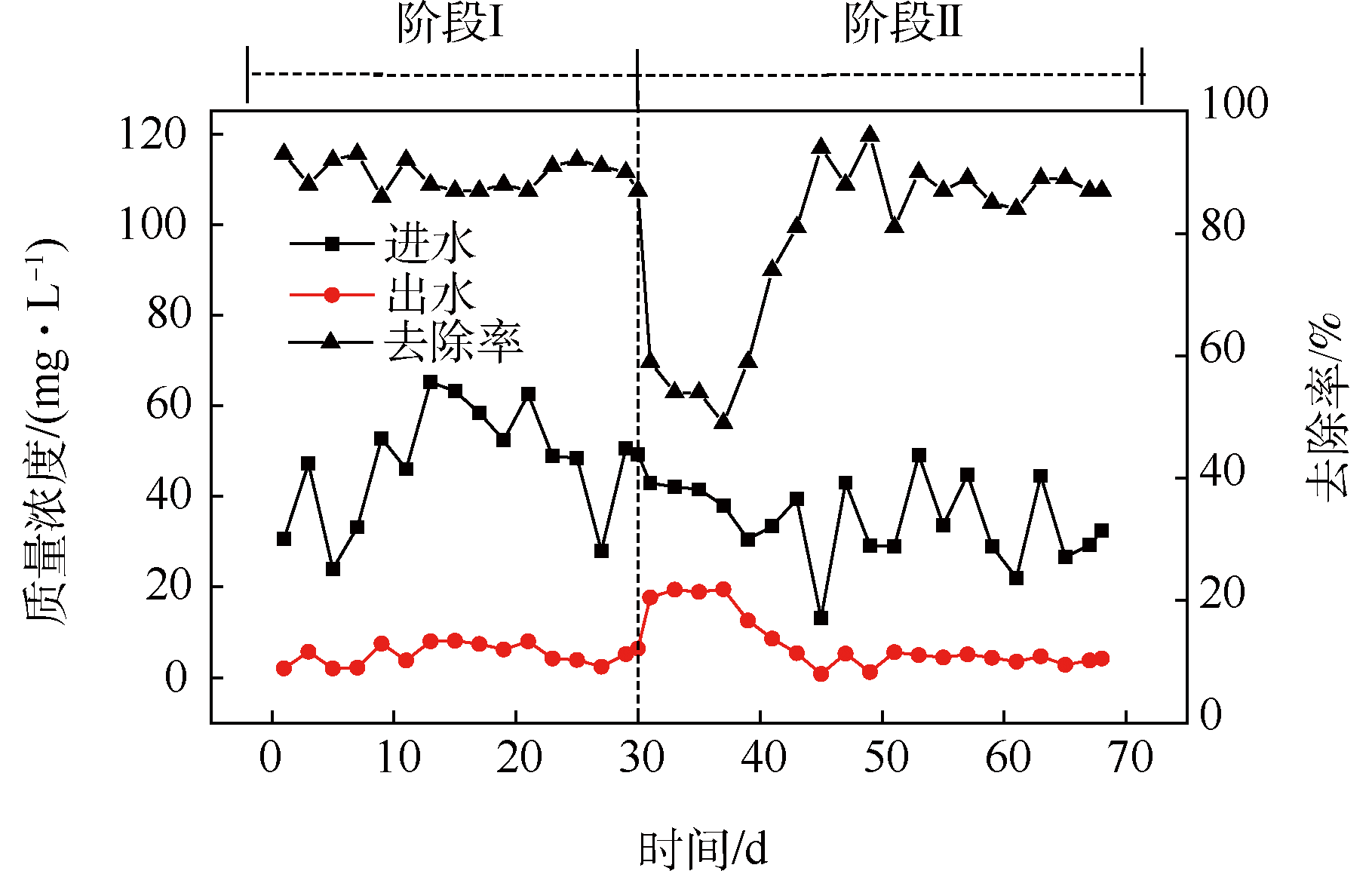 如圖4所示,階段I出水NH4+-N含量相對穩定,平均值為5 mg·L−1,平均去除率將近90%,達到《城鎮污水處理廠污染物排放標準》(GB 18918-2002)一級A標準。NH4+-N高效去除的原因在于運行期間不排泥,較長的SRT促進硝化細菌的生長,并且膜的高效截留作用使硝化細菌得以富集,成為優勢菌種,硝化能力逐漸增強。階段II初期,DO和溫度的改變抑制了硝化細菌的活性,導致出水NH4+-N含量迅速上升,去除率甚至不足50%。但隨著微生物對環境的逐漸適應,氨氧化菌逐漸積累,混合液中的NH4+-N轉換成NO2−-N,出水NH4+-N濃度逐漸下降。運行13 d后出水NH4+-N濃度僅為5.4 mg·L−1,此后平均濃度為4 mg·L−1,去除率一直穩定在88%左右。說明在階段II期間, 雖然亞硝酸氧化菌的活性受到抑制,不能進行全程硝化反應,但氨氧化菌得以富集并逐漸成為優勢菌種,使NH4+-N轉化為NO2−-N,因而出水NH4+-N含量依然保持在較低水平。