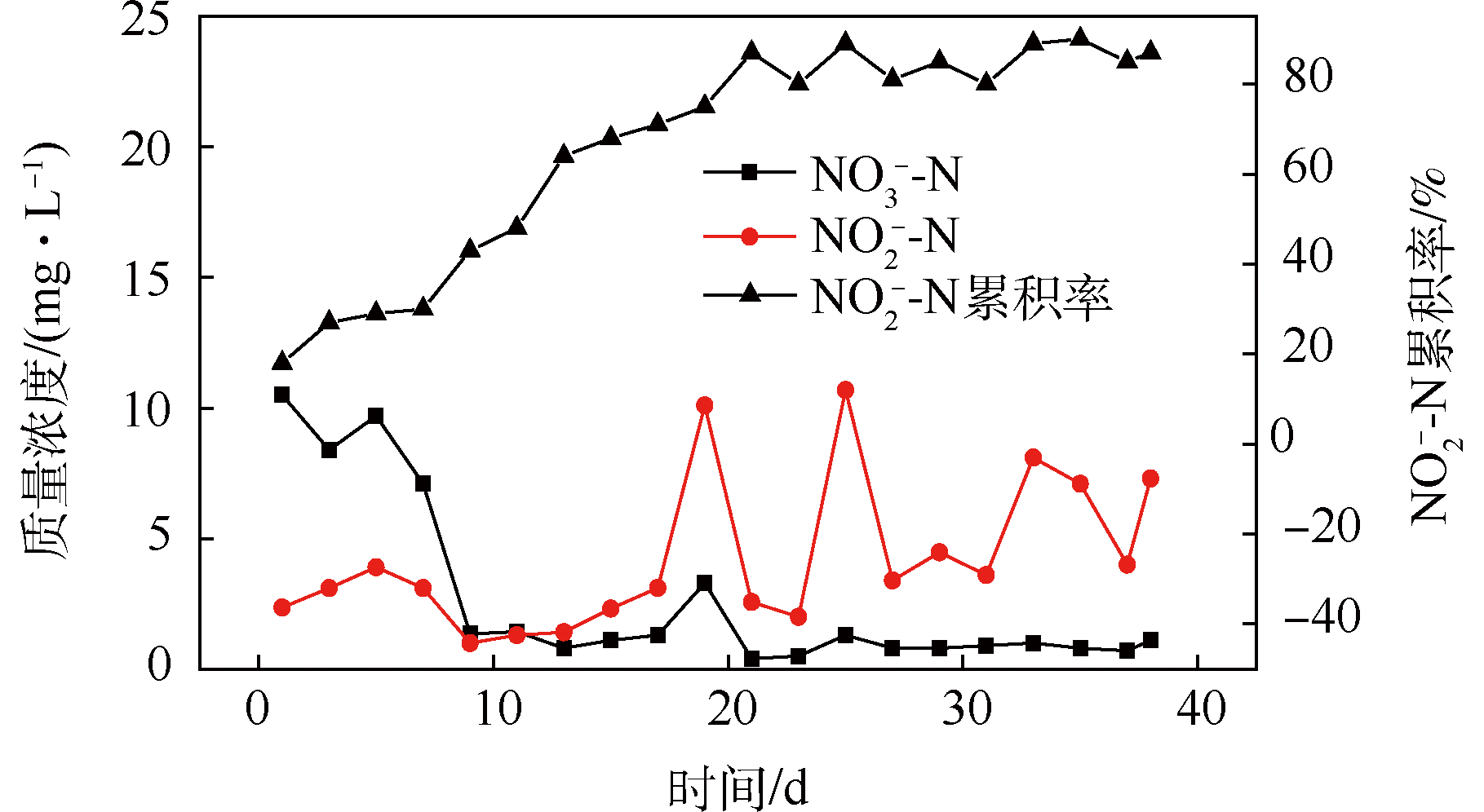 如圖5、圖6所示,階段I運行期間,由于進水TN含量變化范圍較大,導致出水TN含量明顯波動,平均值為24 mg·L−1,去除率僅約58%。TN的去除效果不佳,主要原因是微生物進行反硝化脫氮反應需要消耗碳源,當進水C/N大于6時反硝化所需碳源充足,而實驗運行期間C/N僅為4左右,碳源不足抑制了反硝化脫氮。階段II初期,TN去除率不足40%,主要原因在于溫度和DO的改變導致硝化菌硝化能力不足,出水中NH4+-N含量很高,因而TN去除率低。此時出水NO2−-N開始積累,但仍低于NO3−-N含量,說明此時依然以全程硝化反硝化反應為主。隨著運行時間的延長,出水中NO2−-N含量逐漸升高,NO3−-N含量逐漸降低,當階段II運行13 d后,出水中NO2−-N含量開始高于NO3−-N,NO2−-N累積率逐漸上升,20 d后NO2−-N累積率穩定在80%左右,說明此時以短程硝化反硝化反應為主,氨氧化菌已成為優勢菌種。DMBR-A/O啟動短程硝化反硝化時間約20 d,與SBR[23-24]相比, 減少了10 d以上,原因可能在于SBR中氨氧化菌容易隨出水流失,而DMBR膜組件的高效攔截作用能有效防止菌種流失。但由于進水水質波動較大,實驗過程中O池DO濃度有時超過2 mg·L−1,影響了短程硝化的完全實現;而且短程反硝化速率比全程反硝化速率更快,導致更多NO2−-N在A池被消耗,所以NO2−-N累積率僅穩定在80%左右。與此同時,TN去除率也逐漸升高,最后穩定在75%以上,明顯高于階段I,說明階段II運行工況對TN的去除更加高效。且A池內未設置攪拌裝置,僅利用文丘里混流器和污泥回流聯用達到污泥懸浮效果,不僅大大降低能耗,而且去除效果優于呂亮等研究結果。