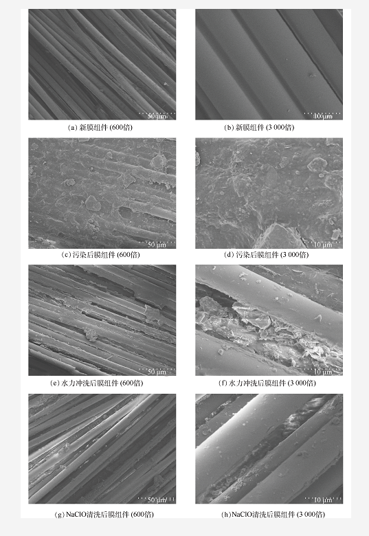 實驗結束后取污染膜組件、水力沖洗后膜組件、0.05%NaClO溶液浸泡后膜組件進行電鏡掃描,并與新組件對比。