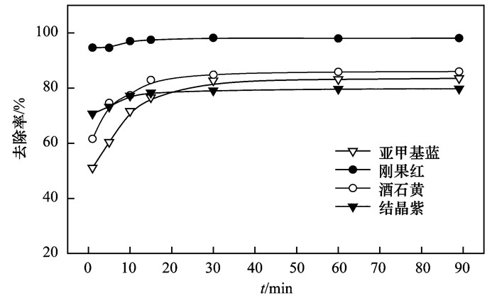 依據染料的陰、陽離子類型及分子體積選取了亞甲基藍、結晶紫、剛果紅、酒石黃這4種常用染料, 染料主要特征參數見表 1.其中4種染料的分子體積使用Chem-Bio3D軟件中的MM2力場參數進行模擬計算, 最大吸收波長(λmax)由UV-6100型紫外分光光度計測得.