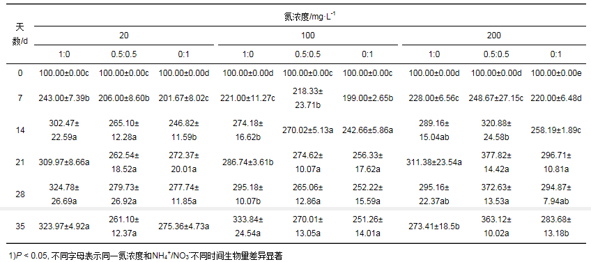 2 結(jié)果與分析2.1 污水氮濃度和NH4+/NO3-比對(duì)粉綠狐尾藻生物量的影響