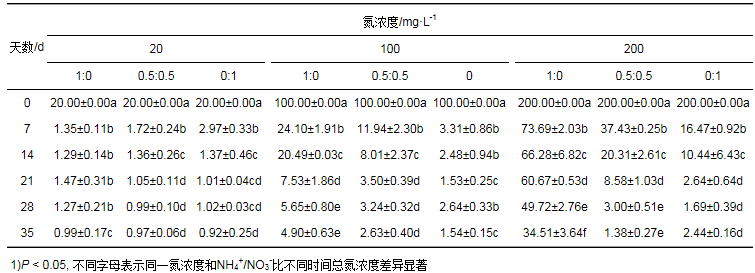 表 3 污水氮濃度和NH4+/NO3-比對(duì)粉綠狐尾藻總氮去除能力的影響1)/mg·L-1