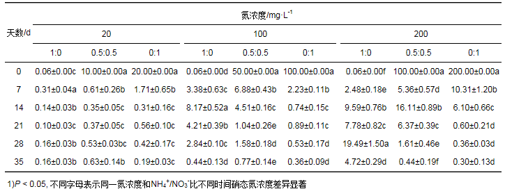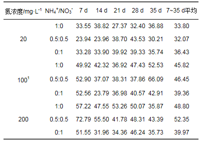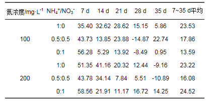 不同處理銨態(tài)氮濃度隨粉綠狐尾藻處理時(shí)間增長(zhǎng)而降低, 且因污水氮濃度和NH4+/NO3-比的變化而不同(表 4).處理7 d時(shí), 氮濃度20、100、200 mg·L-1的NH4+/NO3-為1:0、0.5:0.5的處理銨態(tài)氮的去除率分別為91.7%和96.3%、68.2%和95.9%、72.0%和93.2%; 35 d時(shí)除氮濃度200 mg·L-1的NH4+/NO3-=1:0處理銨態(tài)氮去除率為87.36%, 其它處理去除率基本均達(dá)到100%.不同氮濃度時(shí), NH4+/NO3-=0:1處理銨態(tài)氮濃度均出現(xiàn)增長(zhǎng), 但試驗(yàn)期間一直維持在較低的水平.不同處理銨態(tài)氮的去除速率均在0~7 d最高, 且去除速率隨銨態(tài)氮濃度的升高而增加即以NH4+/NO3-=1:0最高, 隨后隨時(shí)間逐漸降低.氮濃度100 mg·L-1、200 mg·L-1時(shí), NH4+/NO3-=1:0處理在7~21 d仍具有較高的去除速率, 21~35 d銨態(tài)氮的濃度保持穩(wěn)定.由上可知, 不同氮濃度的NH4+/NO3-為1:0和0.5:0.5時(shí), 處理7 d時(shí)銨態(tài)氮均能達(dá)到較高的去除率, 且0~7 d銨態(tài)氮的去除速率均以NH4+/NO3-=1:0最高, 隨后去除速率逐漸下降; 氮濃度100 mg·L-1、200 mg·L-1的NH4+/NO3-=1:0處理在7~21 d仍具有較高的去除速率, 其它處理7 d后銨態(tài)氮濃度基本保持穩(wěn)定, 35 d時(shí)不同處理銨態(tài)氮的去除率均接近100%.粉綠狐尾藻對(duì)銨態(tài)氮的去除能力受污水氮濃度和NH4+/NO3-的影響.