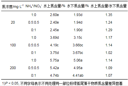 2.3 污水氮濃度和NH4+/NO3-比對(duì)粉綠狐尾藻氮含量和氮積累的影響2.3.1 污水氮濃度和NH4+/NO3-比對(duì)粉綠狐尾藻氮含量的影響