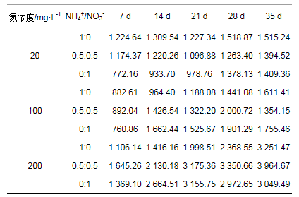 表 2 污水氮濃度和NH4+/NO3-比對(duì)粉綠狐尾藻生物量增長(zhǎng)速率的影響/g·d-1