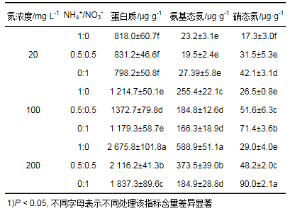 表 12 污水氮濃度和NH4+/NO3-比對(duì)粉綠狐尾藻體內(nèi)氮組分的影響1)