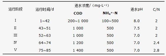 本研究所用主要指標——化學(xué)需氧量(COD)采用快速消解分光光度法; NH4+-N采用納氏試劑分光光度法;NO2−-N采用N-(1-萘基)-乙二胺分光光度法;NO3−-N采用紫外分光光度法;MLSS采用標準重量法;pH采用賽多利斯酸度計測定。游離氨(free ammonia,F(xiàn)A)計算如式(1)所示。