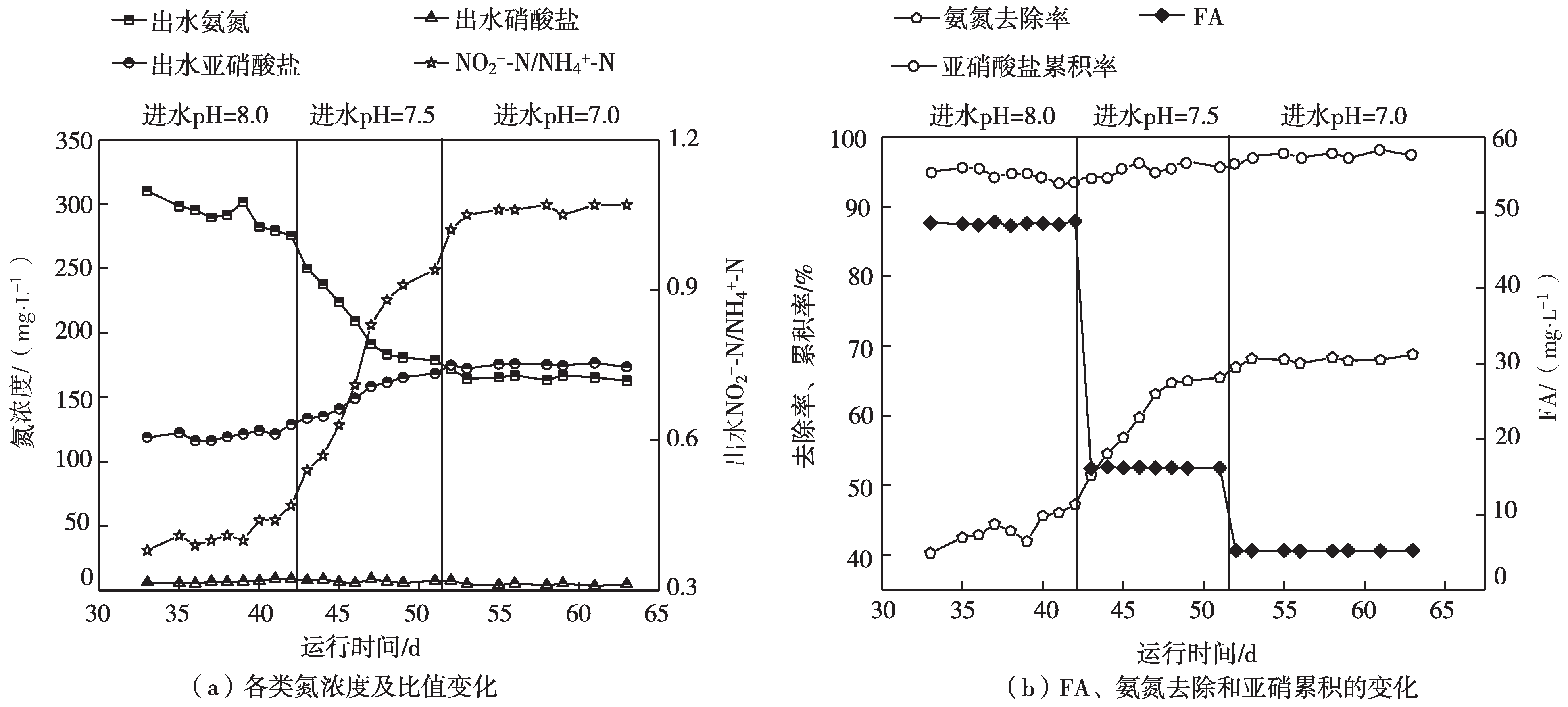 2)進水pH由8.0降至7.0過程中,進水FA由48.5 mg∙L−1降低至5.1 mg∙L−1,有利于NOB選擇性抑制,提高氨氮去除率,出水NO2−-N/NH4+-N比值從0.5提高到0.95左右。COD去除率提高12%,主要是由于同步反硝化消耗碳源的緣故。