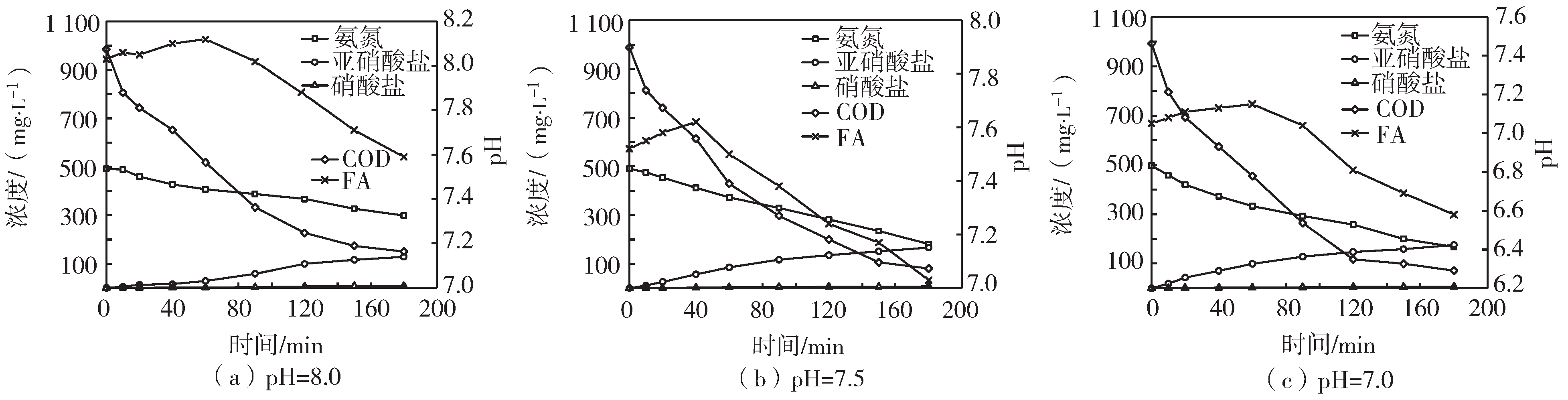 各類微生物都有其適合自身生長的最佳pH,pH對微生物代謝過程和產(chǎn)物存在形態(tài)也會產(chǎn)生重要影響。在亞硝化控制過程中,通過控制不同pH調(diào)節(jié)FA或FNA,有效抑制NOB,促進AOB成為優(yōu)勢種群。本研究探討了pH分別為8.0、7.5和7.0條件下氮轉(zhuǎn)化的影響,見圖3。
