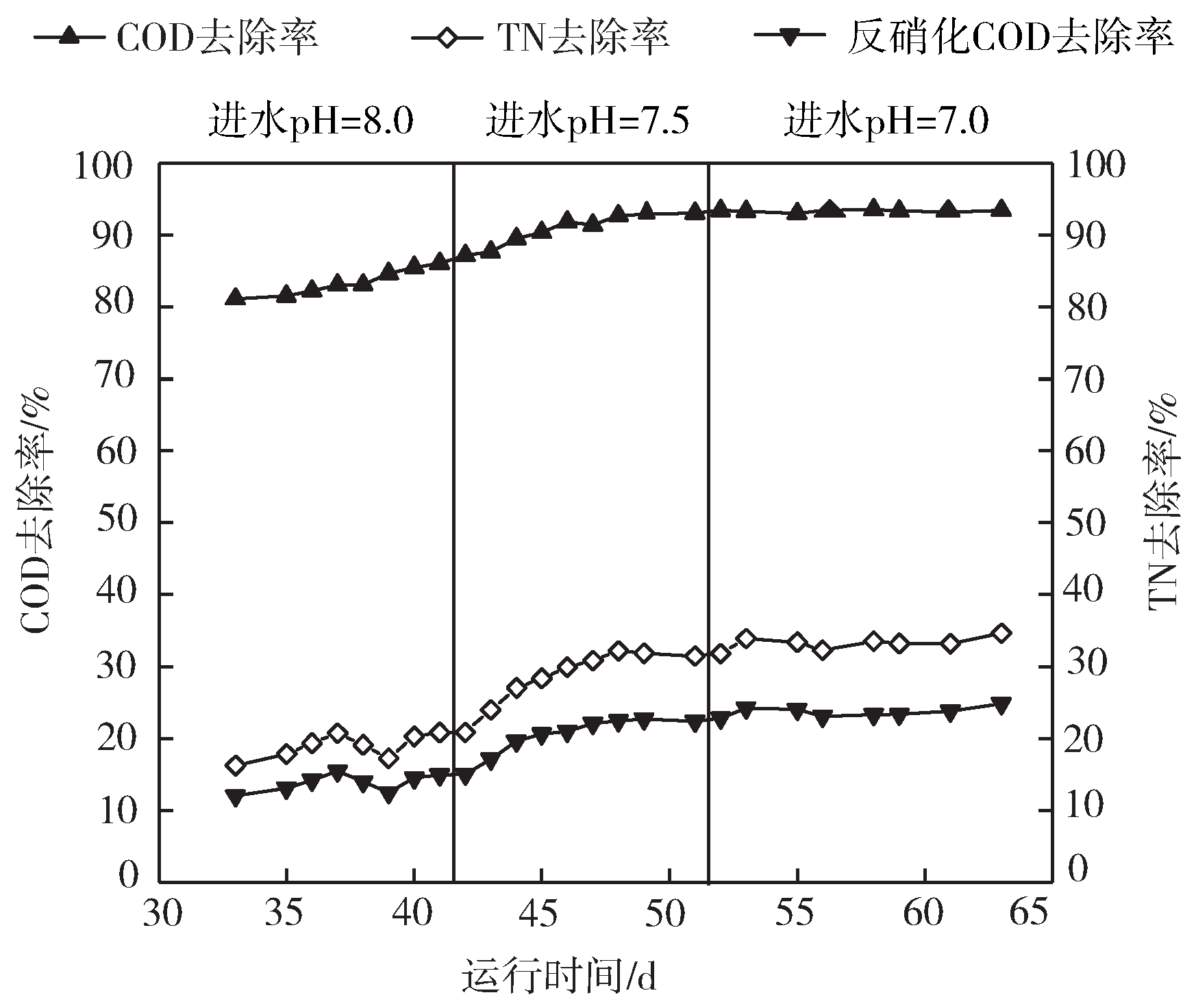 進水pH從8.5降低至7.0,系統(tǒng)COD去除率略有提高(如圖5所示),系統(tǒng)中出現(xiàn)總氮損失,也表明COD除了被直接降解外,還有少量被用作反硝化碳源。系統(tǒng)運行中反硝化消耗的COD(根據(jù)總氮去除量計算)隨總氮去除率同步升高。進水pH由8.0降至7.0的過程中,系統(tǒng)總COD去除率增長主要是由于反硝化消耗碳源,COD去除率增加12%左右。這主要歸因于顆粒物表面的異養(yǎng)菌和氨氧化菌快速消耗顆粒污泥表面溶解氧,使得顆粒污泥內(nèi)部出現(xiàn)缺氧環(huán)境,同時較多的COD可用作反硝化碳源,有機物和亞硝酸鹽經(jīng)由顆粒污泥表面孔隙進入其內(nèi)部,誘發(fā)顆粒污泥內(nèi)部異養(yǎng)反硝化菌的增殖。具體聯(lián)系污水寶或參見http://www.xhxdt.com更多相關(guān)技術(shù)文檔。