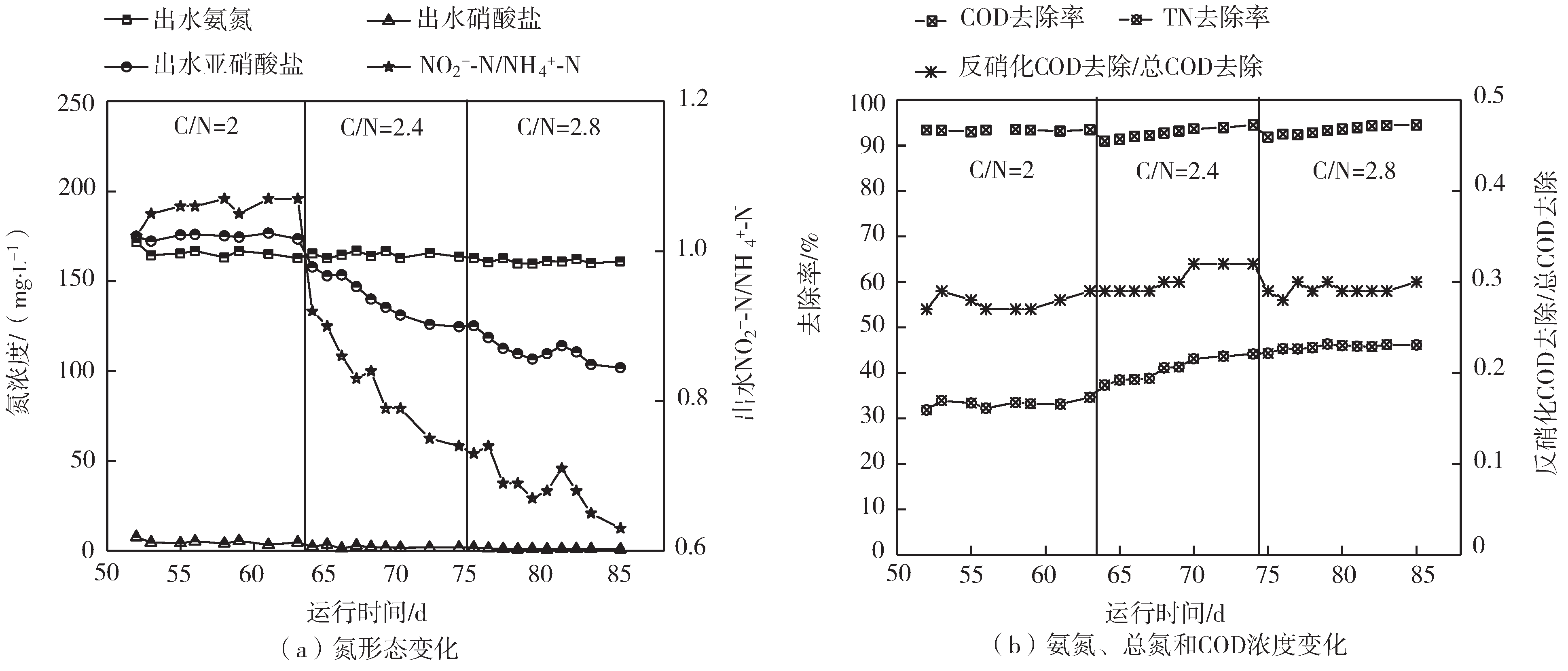 在廢水中,有機物是基質(zhì)中最常見的組分,且有機物濃度也會受各種因素的影響而波動,很難達到理想的C/N比為2:1,有必要探討C/N比對顆粒污泥亞硝化性能的影響。本研究探討了C/N比分別為2、2.4和2.8對氮轉(zhuǎn)化性能的影響。