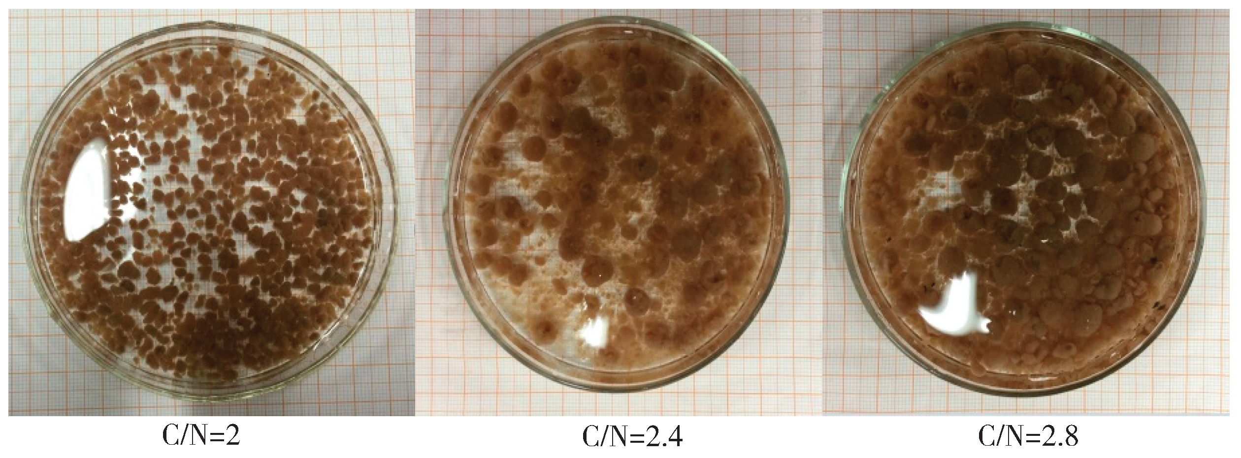 圖7 不同進水C/N比下反應(yīng)器內(nèi)好氧顆粒污泥形態(tài)變化