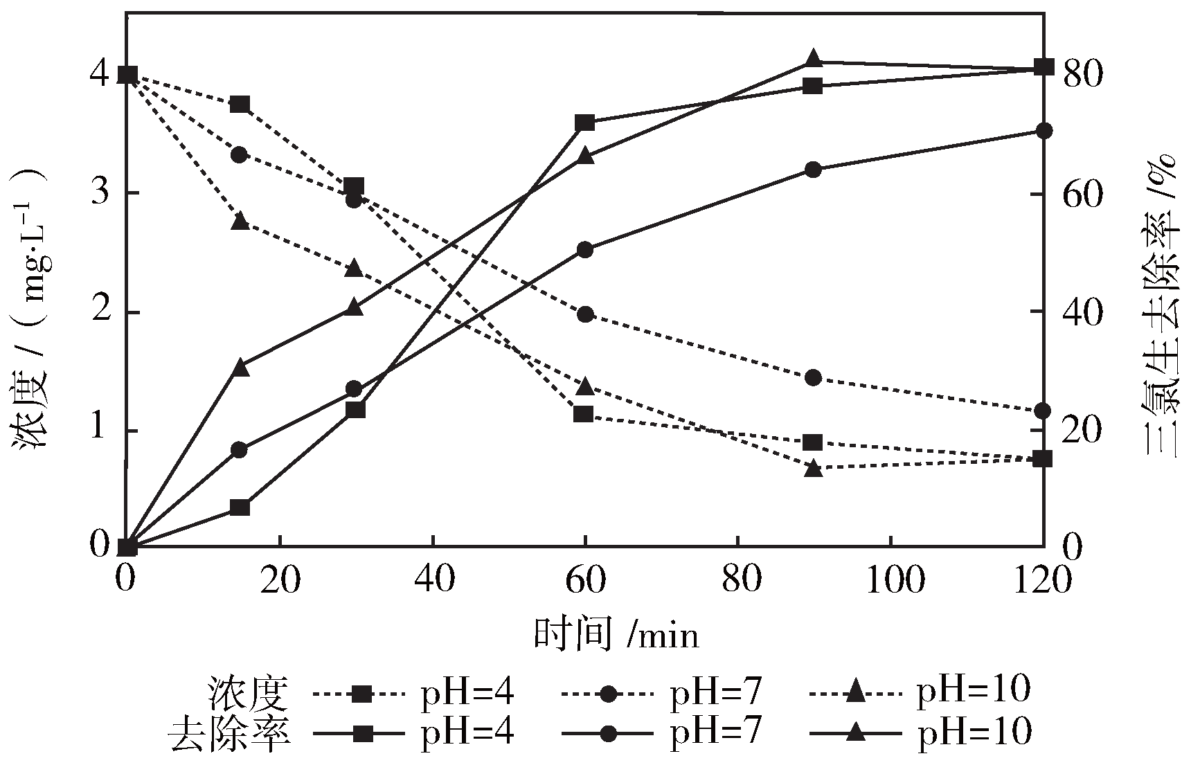TCS初始濃度為4 mg·L−1,電解質Na2SO4濃度為0. 025 mol·L−1,電流密度為10 mA·cm−2,考察pH對TCS去除效果的影響,實驗結果如圖3所示。