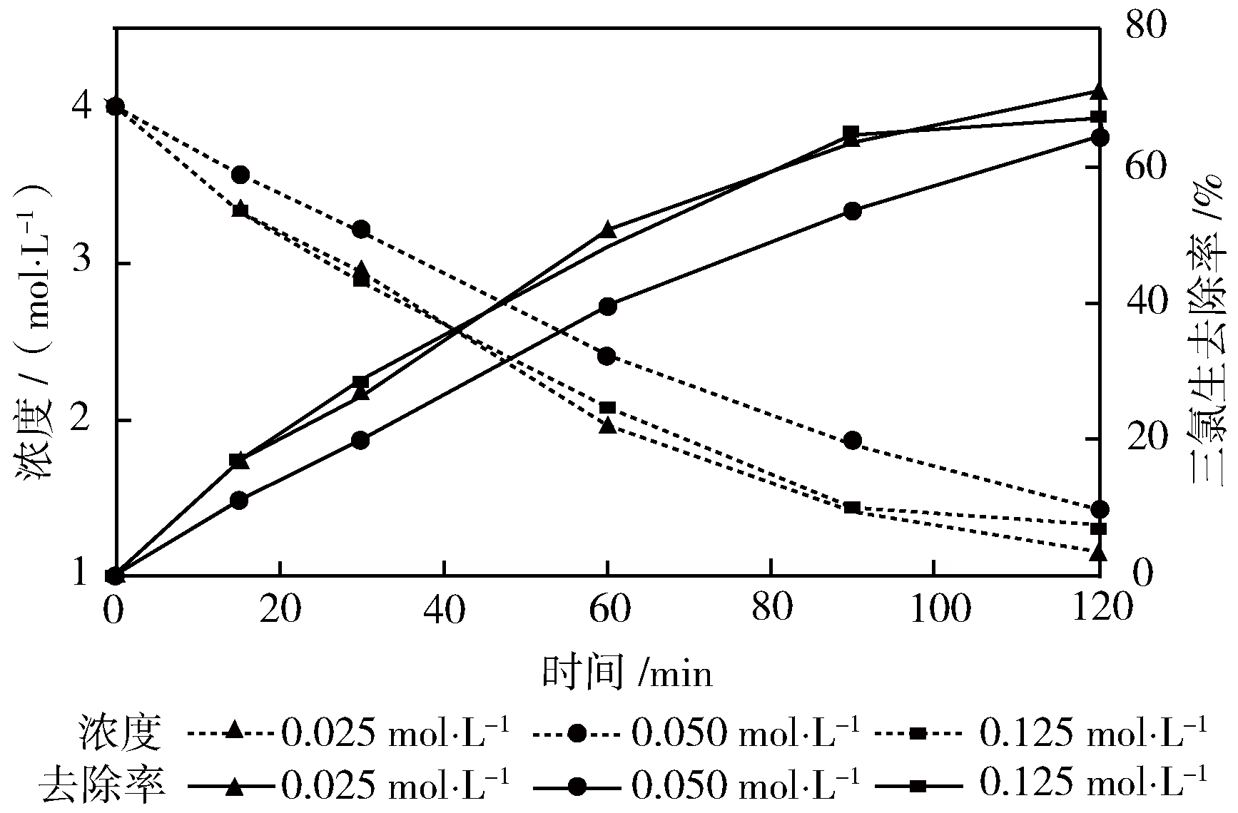 由圖4可知,Na2SO4濃度為0.025 mol·L−1和0.125 mol·L−1時,三氯生的去除率較高,電解2 h時三氯生去除率分別為70.7%和67.5%;而Na2SO4濃度為0. 050 mol·L−1時,三氯生去除效果則變差,電解2 h三氯生去除率僅為64.2%。因此,電解質Na2SO4濃度對三氯生的去除效果影響較大,電解質濃度過高或過低都不利于三氯生的去除。可能的原因在于:電化學反應過程需要維持一定的電流,電解質的增加提升了離子強度,增加了溶液的導電性,因此提高了三氯生的去除效果。但是,電解質濃度過大,離子間距離會變小,相互作用增強,使離子遷移運動阻力增大,反而使溶液導電性降低。而且隨著電解質濃度的提高,電解質吸附在電極表面的可能性增大,如硫酸根離子可能會吸附在正極上,從而阻礙三氯生和電極的接觸反應。另外,三氯生是極性分子,極性分子的偶極也可能會和溶液中的離子發生靜電作用,從而阻礙了三氯生在電極上的遷移,降低三氯生的去除效果。