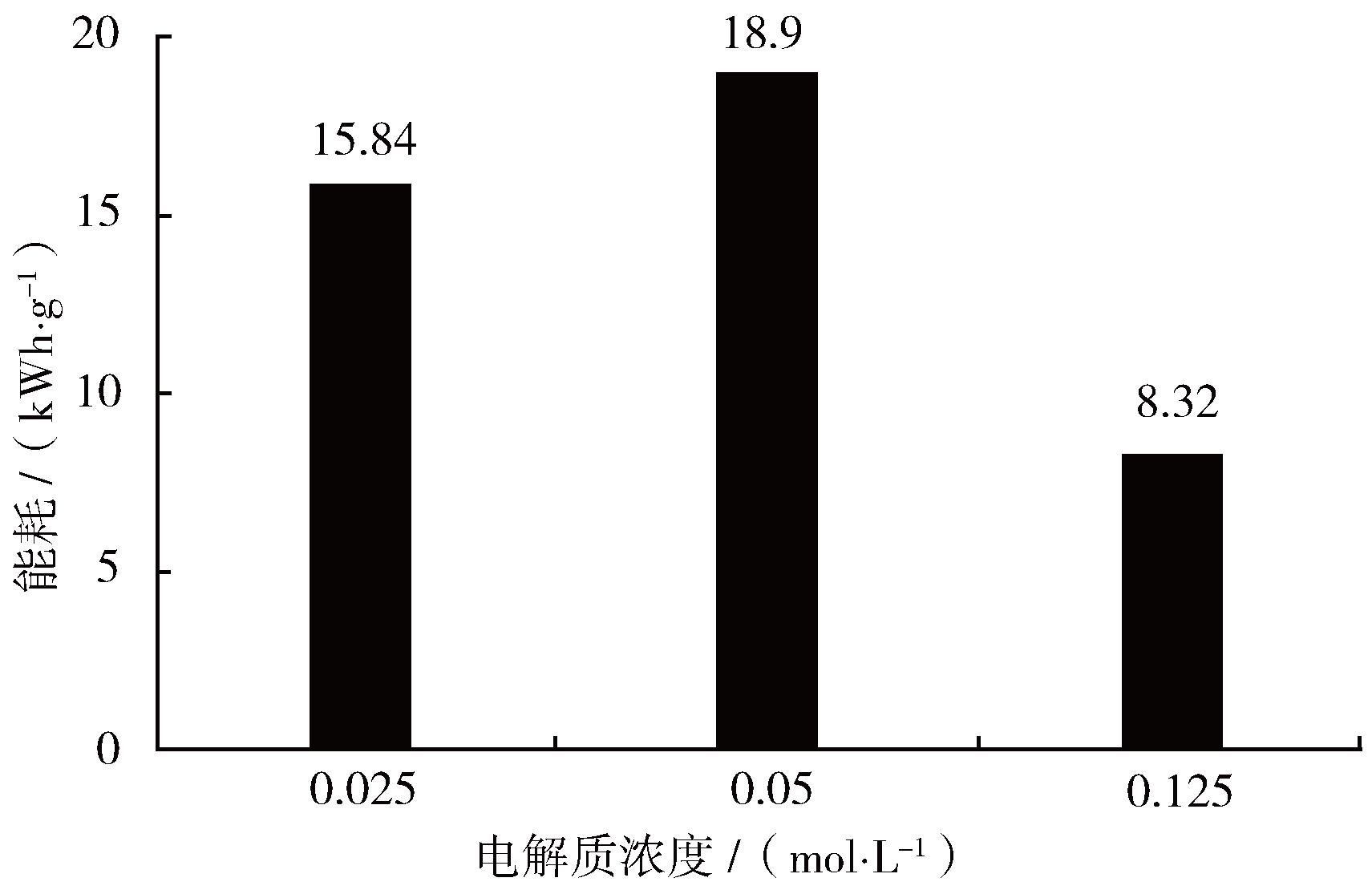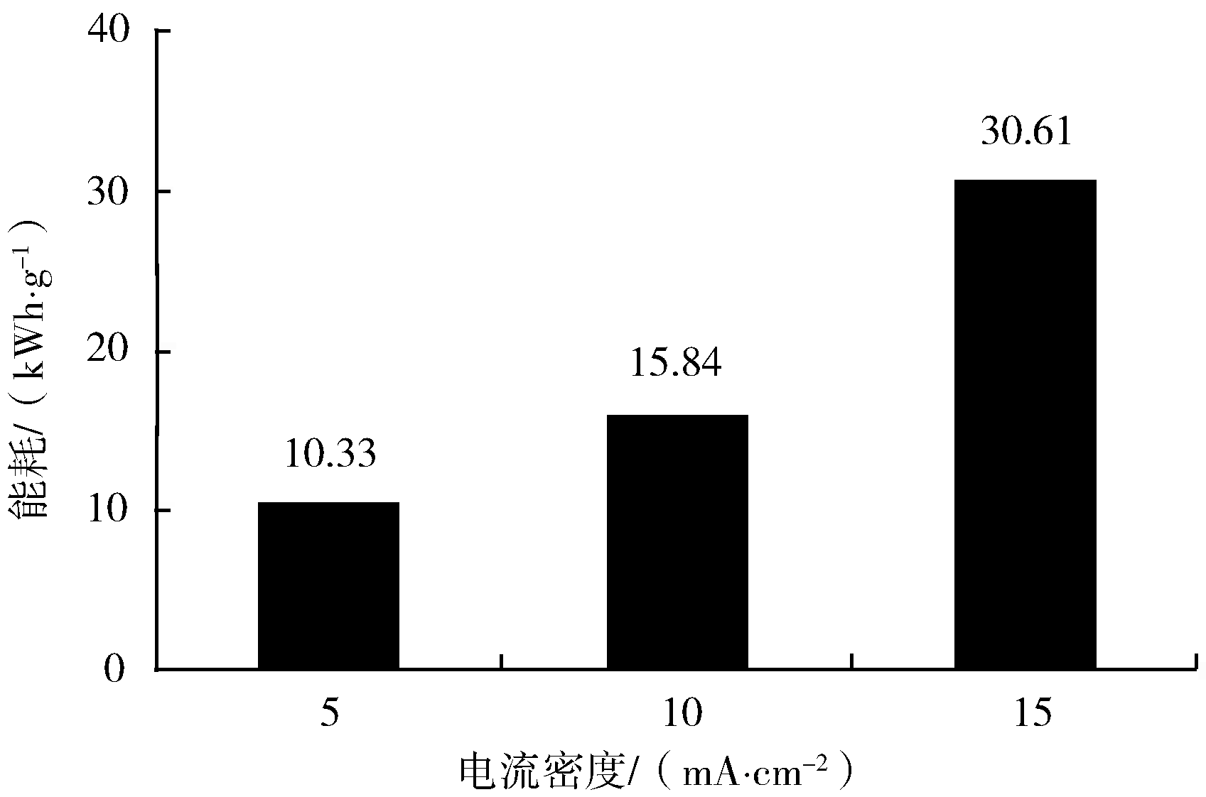 按照式(1)計算出電流密度為10 mA·cm−2、降解率為50%時,電解質濃度分別為0. 025、0. 050和0. 125 mol·L−1的能耗,結果如圖5所示。電解質濃度為0.025 mol·L−1、降解率為50%時,電流密度分別為5、10和15 mA·cm−2的能耗如圖6所示。