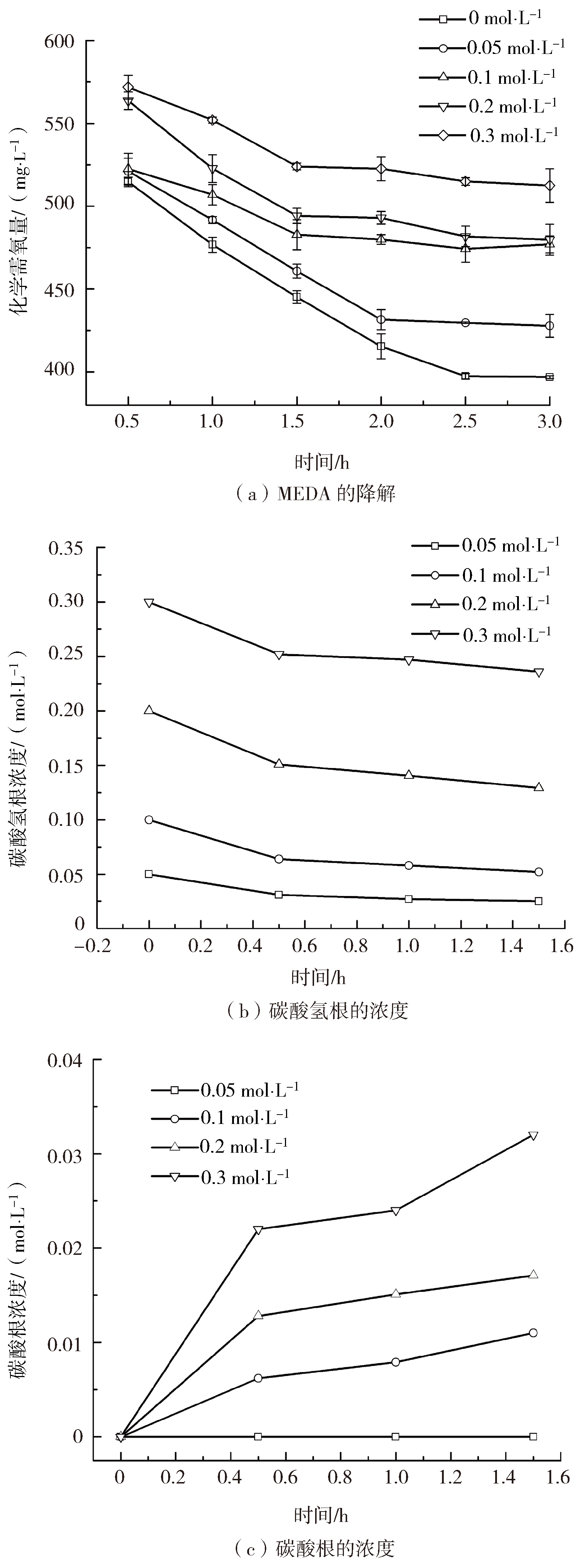 圖2 CO32−對MDEA降解的影響及對應(yīng)CO32−與HCO3−濃度變化