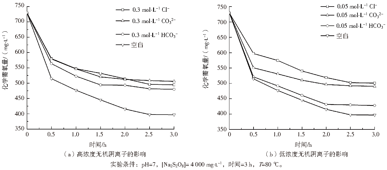 用MDEA配制一定濃度的原水,MDEA初始濃度為1 600 mg·L−1,實測COD為726.8 mg·L−1。反應(yīng)體積為100 mL,取相同體積配制的模擬檢修廢液于150 mL錐形瓶中,利用NaOH溶液或H2SO4溶液調(diào)節(jié)初始pH為7,置于恒溫水浴鍋中,加入不同無機鹽(A:氯化鈉;B:碳酸鈉;C:碳酸氫鈉)以及Na2S2O8溶液,并開始計時。定時取樣檢測水樣COD、過硫酸根剩余濃度以及無機陰離子含量,計算不同時刻COD去除率,獲取不同無機陰離子對熱活化過硫酸鹽體系中降解MDEA的影響。