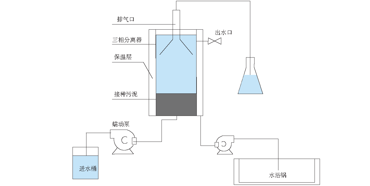 實驗采用有機玻璃材質的上流式厭氧污泥床反應器(UASB),反應器的有效容積為1 L,高280 mm,內徑70 mm,如圖1所示。裝置在(35±1)℃恒溫水浴下運行,反應器底部進水,上部出水,采用蠕動泵調節進水流量。分別設置R1(外加碳源為葡萄糖)和R2(外加碳源為乙酸鈉)2組反應器。