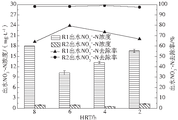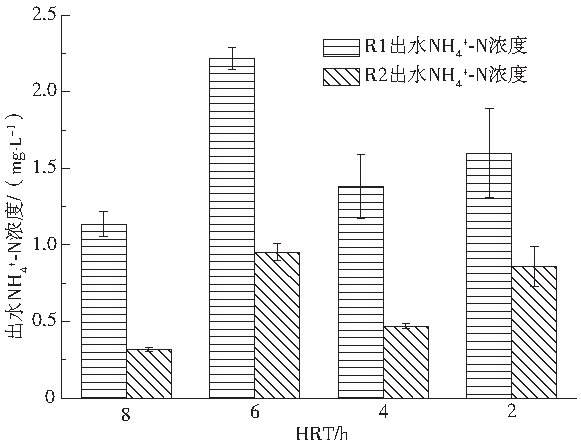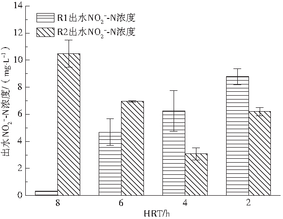 對R2,當HRT從8 h→6 h→4 h→2 h,R2出水NO2−-N濃度從10.47 mg·L−1→6.95 mg·L−1→3.08 mg·L−1→6.20 mg·L−1,從結果看,HRT從8 h降至4 h時,出水NO2−-N濃度明顯降低,這說明有更多的碳源被反硝化菌所利用。值得注意的是,當HRT進一步降至2 h時,出水NO2−-N濃度出現了回升,推測原因是,由于HRT過短,積累的NO2−-N未及時被徹底反硝化就被水流帶出。有研究表明,在序批式反應器進行反硝化實驗,NO2−-N濃度有先升高后降低的趨勢,NO2−-N需要一定時間累積達到峰值而后再降低,這一結果表明HRT對NO2−-N的積累有重要的影響。