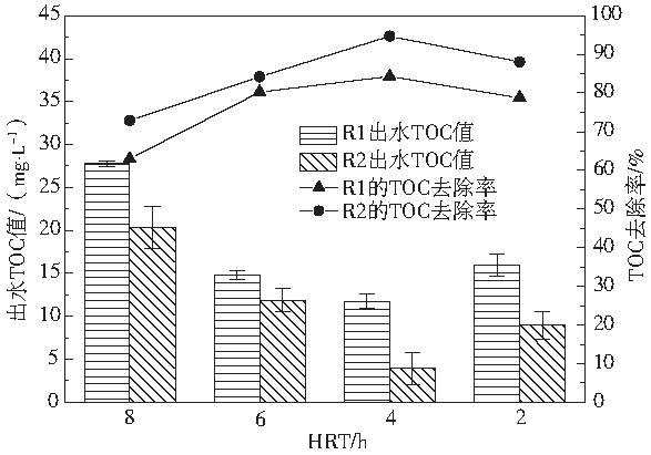 從圖5可見,當HRT從8 h→6 h→4 h→2 h,R1出水TOC濃度從27.77 mg·L−1→ 14.81 mg·L−1→ 11.77 mg·L−1→15.93 mg·L−1,TOC去除率從63.0%→80.2%→84.3%→78.8%;R2出水TOC濃度從20.32 mg·L−1→11.87 mg·L−1→3.96 mg·L−1→8.99 mg·L−1,TOC去除率從72.9%→84.2%→94.7%→88.0%。總的來看,R1和R2出水TOC隨HRT變化趨勢是一致的。值得注意的是,當HRT從8 h縮短至4 h時,R1和R2的TOC去除率不降反升。分析原因,廢水中TOC主要可能通過有機碳源參與反硝化生成二氧化碳、同化作用合成新的細胞體以及甲烷化3種途徑去除,本實驗中未觀測到有甲烷氣體產生,因此,在R1和R2中,前2種應是TOC去除的主要途徑。本實驗中廢水C/N僅為1.5,屬低C/N比廢水,有機碳源主要用于反硝化,這與RUIZ等的研究結論一致。就R1而言,當HRT較長時(如8 h和6 h),發酵細菌會跟反硝化菌爭奪碳源,但發酵過程主要生成一些酸類、醇類等中間產物,并未直接將有機物全部轉化成CO2和甲烷,相應的TOC去除并不多。對R2,相對較長的HRT可能有利于其他異養菌(發酵細菌以外)同反硝化菌競爭有限的碳源,而反硝化又在去除TOC上有相對較大的貢獻。此外,HRT縮短(從8 h→4 h),UASB反應器內的上升流速增加,強化了反應器內的泥水混合,提高了傳質效率,這也是R1和R2中TOC去除率不降反升的重要原因。當HRT從4 h進一步縮短至2 h時,R1和R2的TOC去除率均下降,這是因為,在過短的HRT下,一方面,反硝化消耗的碳源會減少;另一方面,溶解性微生物產物的洗出效應增強,導致出水TOC升高。
