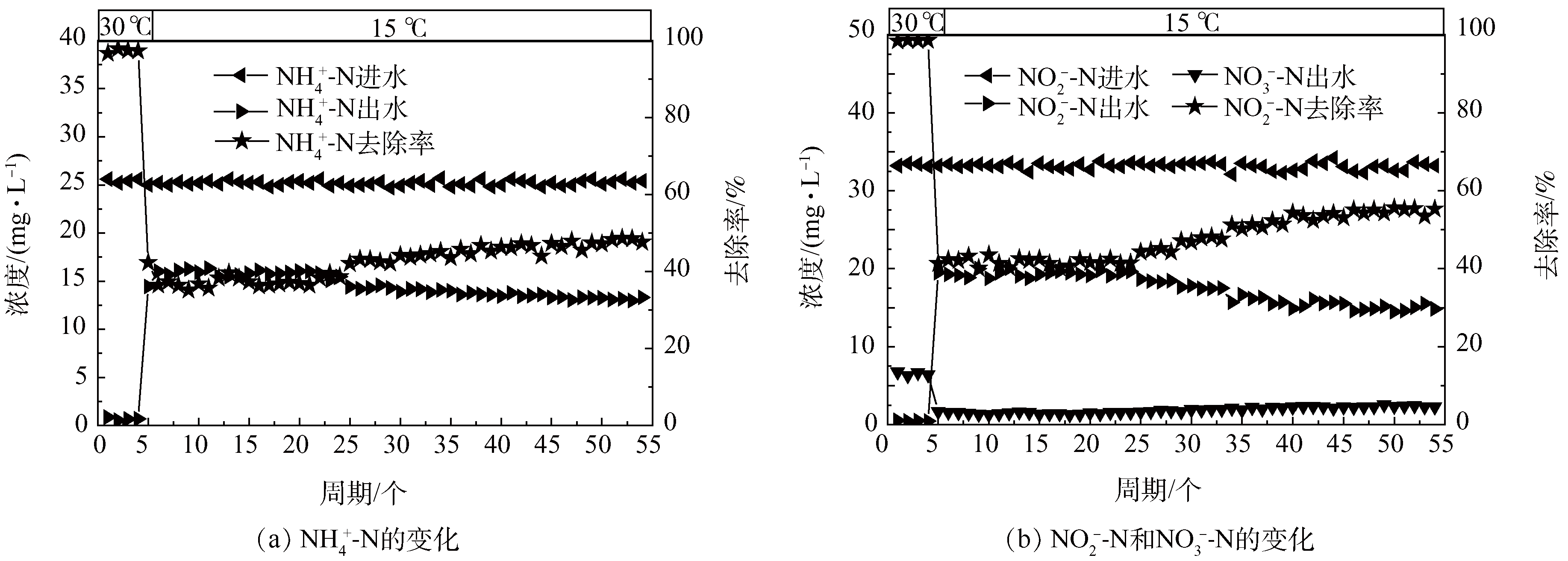 一次性降溫至15 ℃后反應器的出水NO3−-N濃度由6.3 mg·L−1降至1.8 mg·L−1,之后緩慢上升,最終穩定在2.3 mg·L−1。溫度降低,出水NO3−-N濃度降低,這可能是因為厭氧氨氧化反應速率減小或存在反硝化,但是進水沒有有機碳源,不存在反硝化,故厭氧氨氧化反應速率減小導致出水NO3−-N濃度降低。