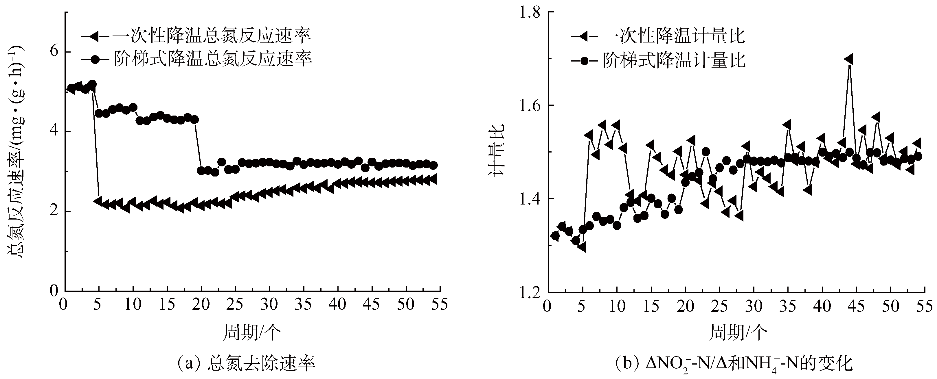 圖4為一次性降溫和階梯式降溫方式總氮的去除速率及ΔNO2−-N/ΔNH4+-N(反應掉的NO2−-N量與反應掉的NH4+-N量的比)的變化。由圖4(a)可知,在30 ℃下,一次性降溫和階梯式降溫總氮去除速率均為5.10 mg·(g·h)−1。一次性降溫至15 ℃時,總氮去除速率降至2.74 mg·(g·h)−1,階梯式降溫至15 ℃時,總氮去除速率降為3.22 mg·(g·h)−1,這主要是低溫會使酶作用降低或停止,而厭氧氨氧化菌最適溫度為30~35 ℃,故在低溫下厭氧氨氧化菌酶作用降低,導致厭氧氨氧化反應速率下降。階梯式降溫比一次性降溫總氮的去除速率高0.48 mg·(g·h)−1。一次性降溫達到總氮去除速率穩定運行所需的周期為49周期,階梯式降溫總氮去除速率達到穩定所需的周期為26周期,即階梯式降溫方式下總氮去除速率達到穩定運行所需的時間較短。
