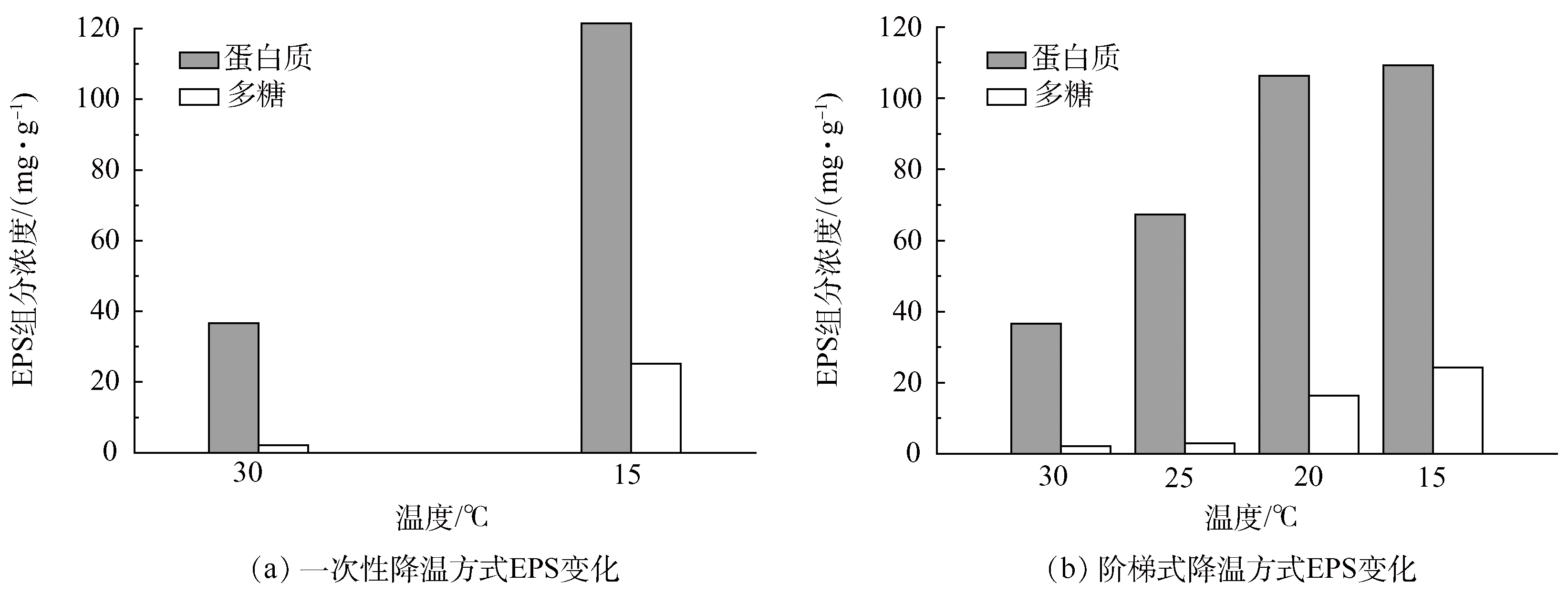 圖5、圖6為2種降溫方式下厭氧氨氧化活性、總氮去除負荷(TNRR)以及胞外聚合物(EPS)的變化。由圖5(a)可知,在30 ℃下,一次性降溫和階梯式降溫厭氧氨氧化活性(SAA)均為0.139 g·(g·d)−1。一次性降溫至15 ℃時,SAA降至0.071 g·(g·d)−1,降幅為48.9%。階梯式降溫方式下,SAA呈現階梯式減小,至15 ℃時,SAA降為0.083 g·(g·d)−1,降幅為40.1%。楊洋等[24]也發現采用階梯式降溫對SAA的影響較小。