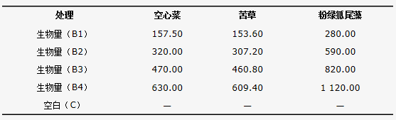 2)實驗過程中,生物量對氮磷凈化效果影響較小,不同植物去除總氮的最佳生物量處理為空心菜 157.50 g、苦草460.80 g、粉綠狐尾藻1 120.00 g,總磷的最佳生物量處理為空心菜157.50 g、苦草609.40 g、粉綠狐尾藻590.00 g。