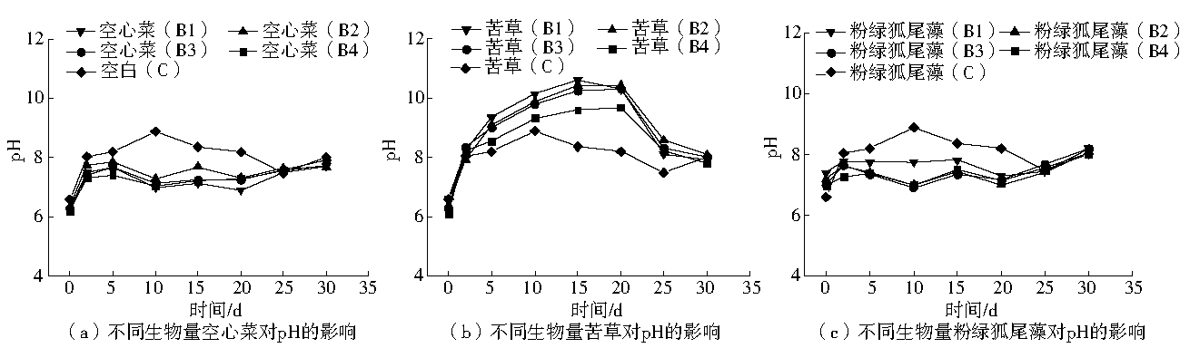 不同植物處理水體pH有所不同,苦草、粉綠狐尾藻、空心菜3種水生植物水體pH平均值分別為8.94、7.46和7.30。pH變化與DO相似,苦草水體pH顯著高于其他2種植物?嗖菟wpH開始時快速上升,20 d上升到最高,各組pH均高于9.68,粉綠狐尾藻和空心菜水體pH均隨時間呈現(xiàn)波動上升的趨勢(圖3)。水體pH受生物量影響,但整體差異不顯著?嗖菟wpH隨生物量增加呈下降趨勢。最高空心菜生物量處理組(B4)在實驗初期pH低于最低空心菜生物量處理組(B1),后期高于最低空心菜生物量處理組?瞻讓φ誴H呈先升高、后降低的趨勢。苦草水體pH大于空白對照,粉綠狐尾藻和空心菜處理組水體均低于空白對照。對pH進行方差分析,結(jié)果表明,第5、15和30天,受植物類型影響顯著(P≤0.05),生物量對pH影響較小。