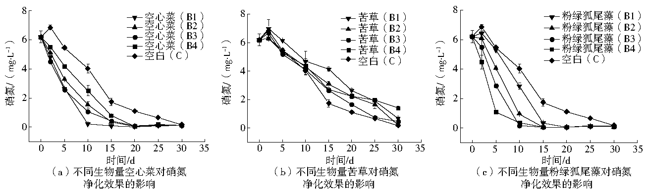 總氮凈化效果(30 d)受植物類型影響顯著(P<0.05)。粉綠狐尾藻對總氮凈化效果好于其他2種植物,從去除總氮角度,粉綠狐尾藻可以作為污水凈化的先鋒物種。實驗前期,粉綠狐尾藻TN濃度與種植密度呈現(xiàn)良好的負相關(guān)關(guān)系 (R=−0.989,P<0.05)?偟コ緩街饕撬参飳I養(yǎng)鹽氮素的吸收和微生物的硝化-反硝化作用,以及基質(zhì)的吸附沉淀作用。生物量高時吸收能力較強,同時,更大的根表面積也為微生物附著提供了空間,有利于氮素的去除。高粉綠狐尾藻生物量處理組的凈化效果最好,而其他2種水生植物高生物量處理組凈化效果反而低,說明過高的生物量并不會帶來更好的凈化效果,這與宋超等的研究結(jié)果一致。植物的生長情況對凈化效果會產(chǎn)生影響,在空心菜處理組,低生物量生長情況最好,生物量在實驗周期內(nèi)持續(xù)升高,凈化效果后期逐漸好于其他處理組,而其他高生物量處理組則出現(xiàn)衰亡,后期凈化效果不顯著,說明最低空心菜生物量處理(B1)有利于總氮的去除?嗖、粉綠狐尾藻、空心菜3種植物凈化總氮最佳生物量分別為157.50、460.80和1 120.00 g。