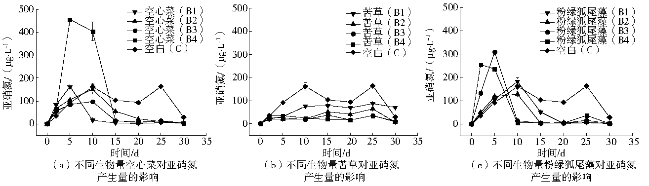 圖7 不同水生植物和生物量對亞硝氮產(chǎn)生量的影響