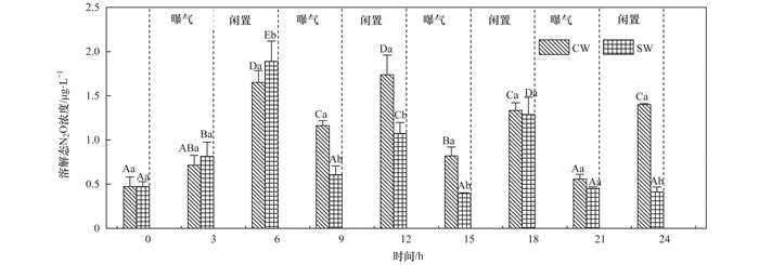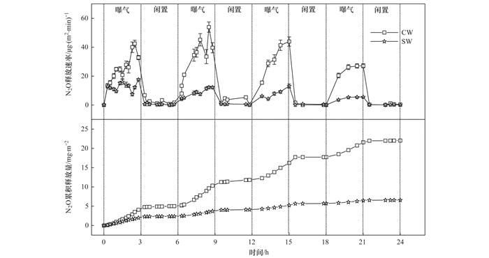 CW和SW各階段末端溶解態N2O濃度如圖 5所示.CW和SW系統平均溶解態N2O濃度分別為1.05 μg·L-1和0.83 μg·L-1.閑置段末端各系統溶解態N2O濃度明顯高于曝氣段末端, 這是由于閑置段溶解于水中的N2O在曝氣過程中被吹脫釋放所致.由于水中N2O溶解度有限, 反應初期各濕地N2O釋放速率均較大, CW和SW內部溶解態N2O含量差異不顯著(P>0.05);隨著反應進行, SW較低的N2O釋放速率使得其內部溶解態N2O濃度低于CW.系統N2O排放主要集中在曝氣段, 而產生的N2O溶解于水中又被吹脫出來, 故系統中溶解態N2O只占釋放總量的極少部分.