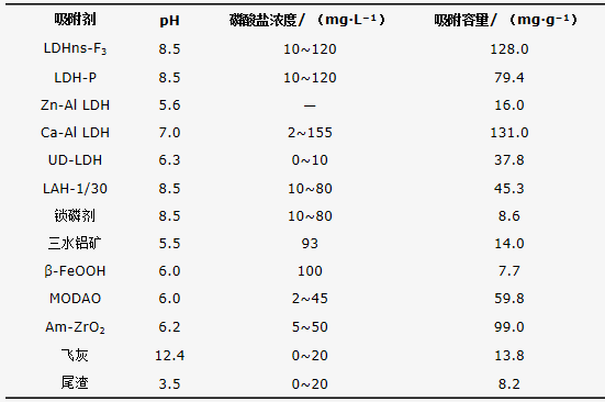 表5比較了多種吸附劑對磷酸鹽的最大吸附容量。對比發現,本研究合成的LDHns-F納米片的除磷能力高于其他大部分吸附劑,如Zn-Al LDH、三水鋁礦、針鐵礦、飛灰和鎖磷劑Phoslock(鑭改性膨潤土,澳大利亞Phoslock Watar Solution Ltd.公司,已應用于世界上200多個富營養化湖泊磷污染控制)。水滑石納米片吸附容量高于層狀水滑石,機理在于納米片的片層結構暴露出了更多的表面羥基吸附活性位點,而這些是在傳統的LDHs中達不到的。表5顯示,Ca-Al LDH的最大固磷量為131 mg·g−1,略高于本研究,但是這是吸附與表面沉淀共同作用的結果,含鈣的水滑石比含鎂的水滑石更容易溶解,溶解的鈣會與磷形成磷酸鈣沉淀反應。而且在pH低于8~9的情況下,沉淀會發生溶解,從而再次釋放出磷酸鹽。鐵氧化物和氧化鋯類吸附劑在天然水體或市政排水的pH條件下(6~9)通常帶有負的表面電荷,因此,對于帶負電荷的磷酸鹽類污染物會形成一定的靜電排斥作用,影響了材料的固磷效率。而本研究中的水滑石納米片在pH 4~11的范圍內,都能維持表面的正電荷,能夠滿足市政污水、工業廢水和富營養化水體等多種含磷廢水處理的使用需求。因此,LDH納米片吸附效率高、容量大,且適用范圍較廣,是一種可用于處理高濃度含磷水體的高效吸附劑。