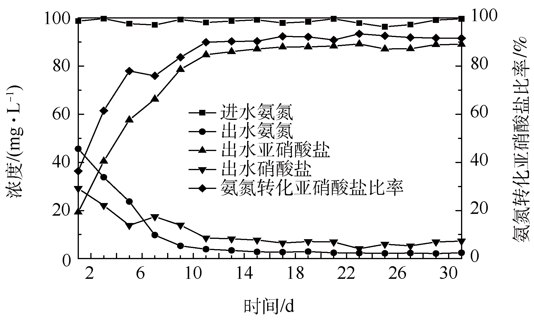 圖2為階段1氨氮處理效果與氨氮轉化亞硝酸鹽比率。由圖2可知,進水氨氮平均為98.39 mg·L−1,出水氨氮的濃度在前7 d快速下降, 1、3和5 d分別為45.6、33.8、23.7 mg·L−1, 7 d降低至9.8 mg·L−1,之后趨于穩定。9~31 d的平均值為2.89 mg·L−1,氨氮的去除率穩定在91%左右,說明反應器氨氮的去除率效果較好。