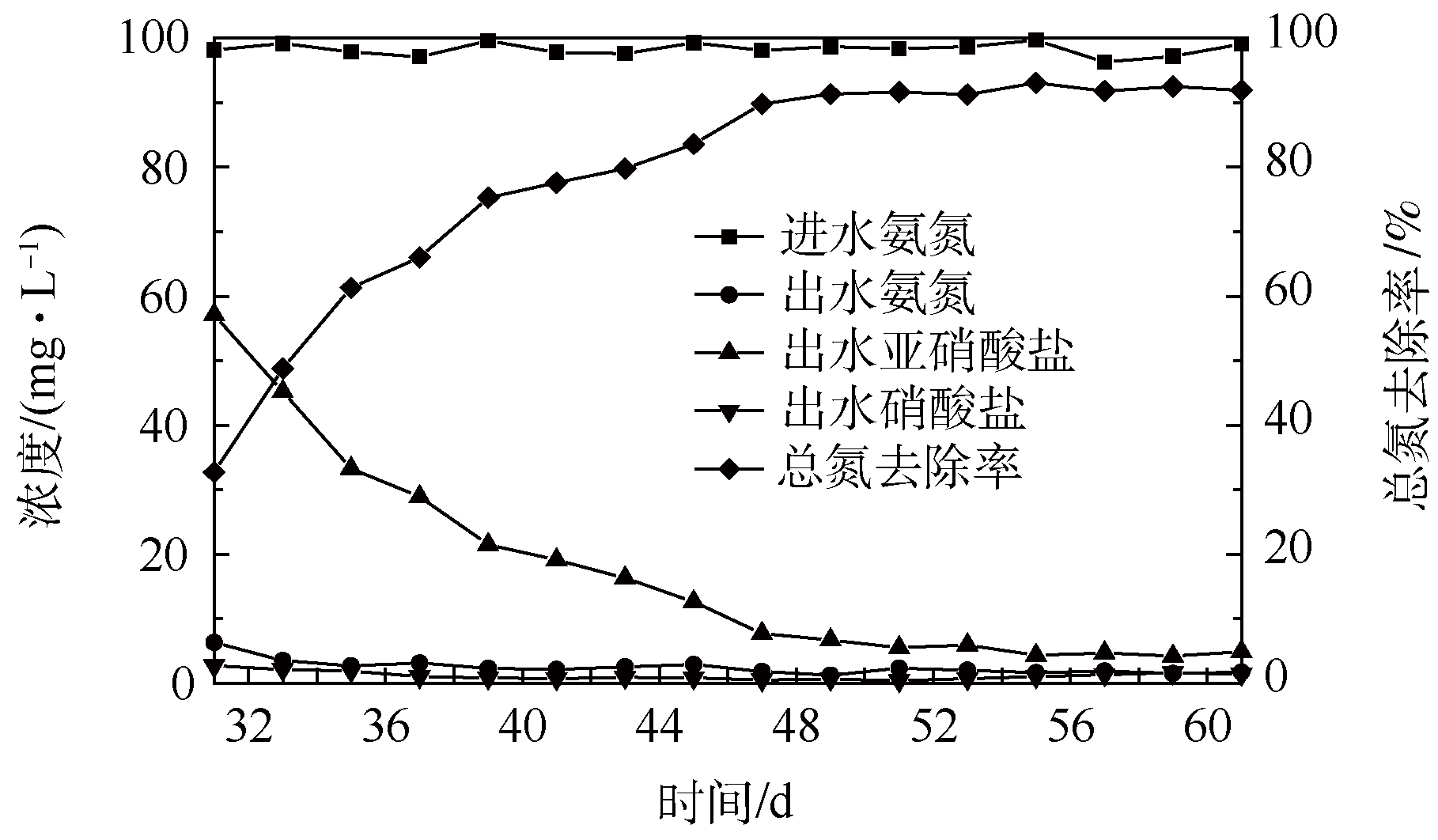 在31~61 d,通過調整反應器循環時間以及增加厭氧階段,短程硝化后加入了反硝化。圖3為階段2氨氮處理效果與總氮去除率。由圖3可知,進水氨氮濃度平均為98.3 mg·L−1,出水氨氮從開始就穩定保持在5 mg·L−1以下,說明有較好的除氨氮效果。出水中硝酸鹽含量極低,證明反硝化過程中硝酸鹽由硫化物提供的電子轉化為亞硝酸鹽,繼而轉化為氮氣。出水亞硝酸鹽的濃度呈現下降的趨勢,31~47 d逐步下降,從57.1 mg·L−1下降并穩定至10 mg·L−1。總氮去除率從31~49 d逐步上升,由起始32.68%上升并在49 d后穩定在90%以上。由于進水中含有較低濃度的COD,存在著異養型反硝化。起始階段受到COD濃度限制,異養型反硝化效果較差,隨著反應器運行時間的增加,污泥里的自養型反硝化細菌群會逐漸繁殖,反硝化效果會逐漸增強,除氮效果明顯提升。