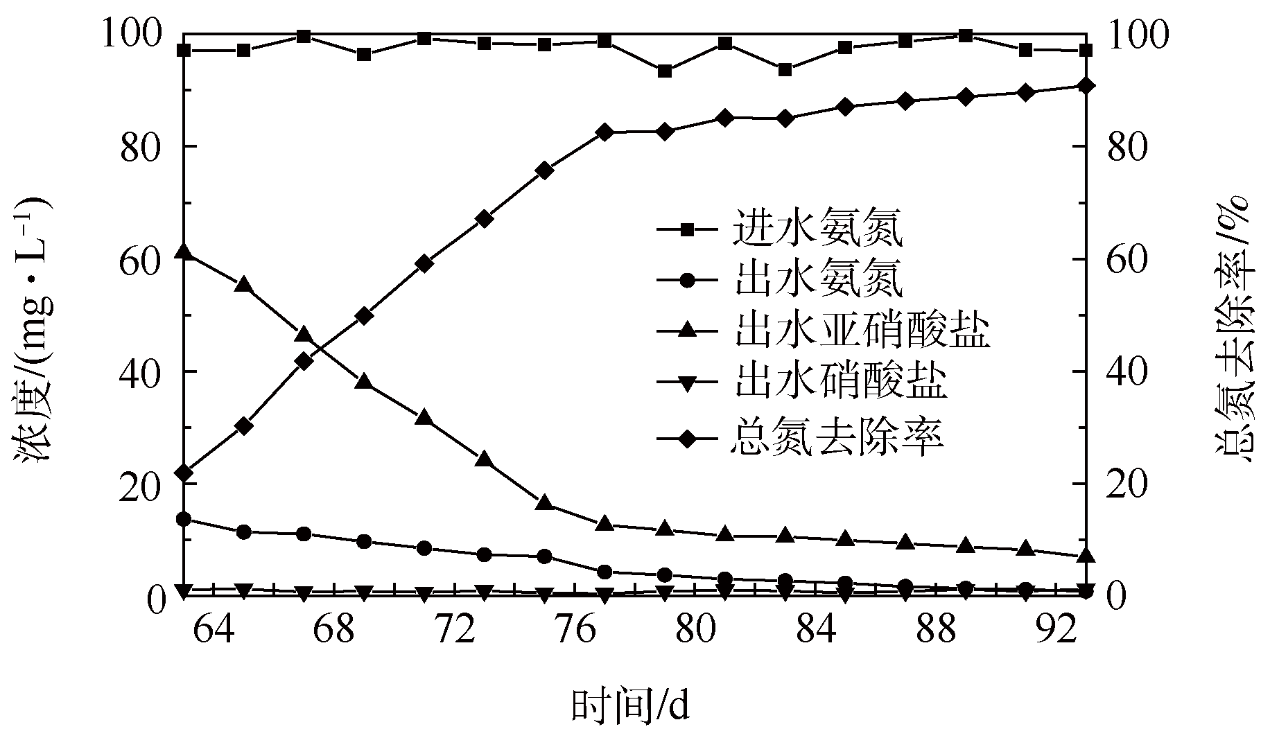 階段3:短程硝化反硝化穩定運行。在61~91 d,SBR循環縮短為6 h。循環包括10 min供水,2.5 h低氧,2.5 h厭氧,30 min沉淀和20 min出水,水力停留時間(HRT)為12 h。配水組成與階段1相同。