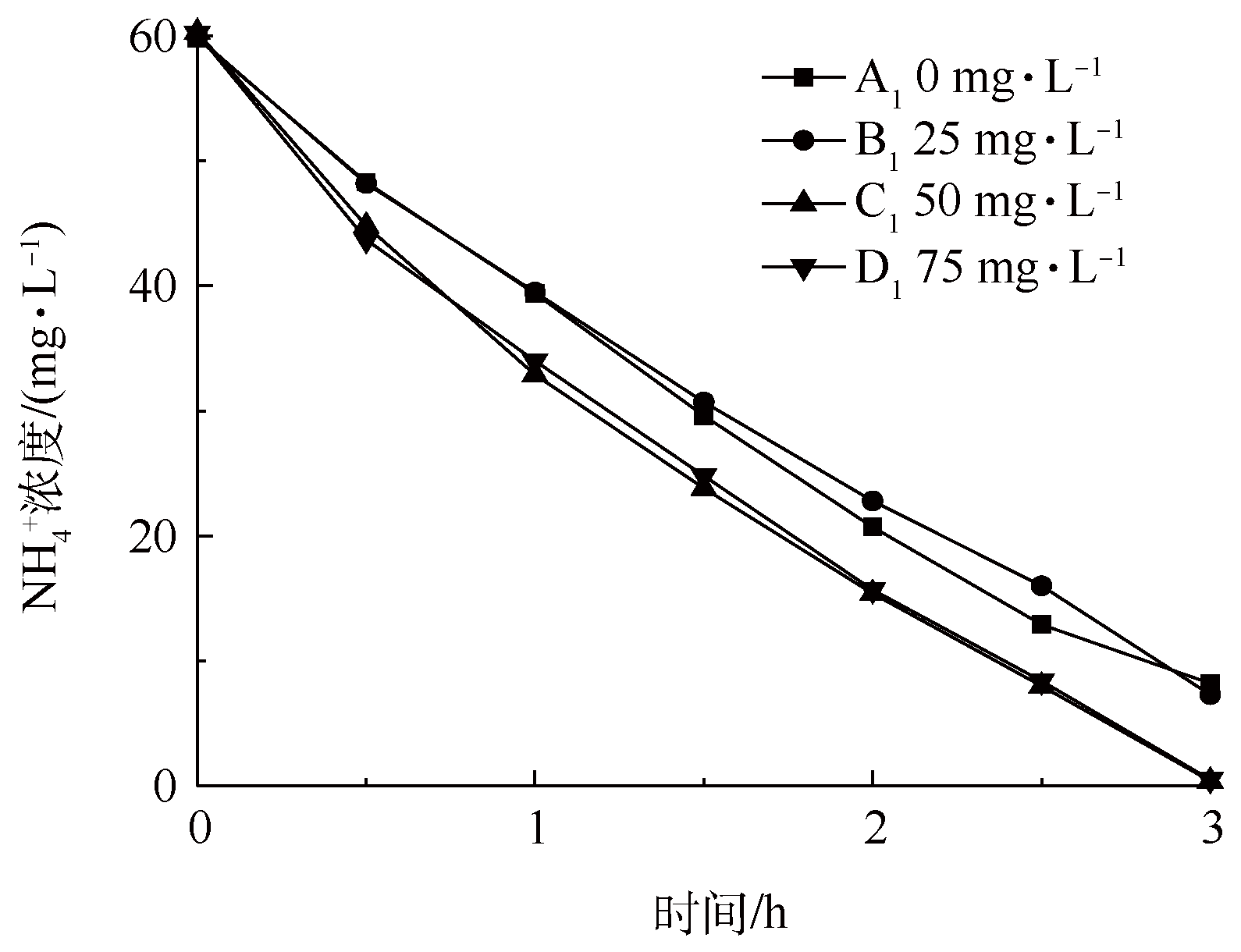 圖9 不同濃度硫化物條件下反應器A1、B1、C1、D1氨氮濃度變化